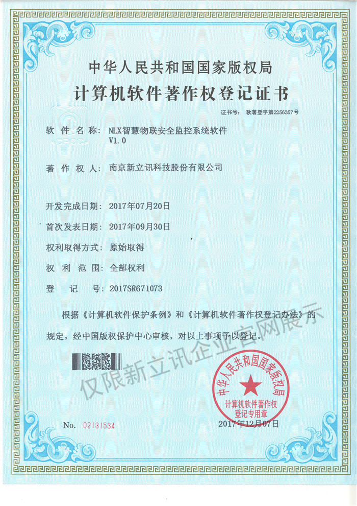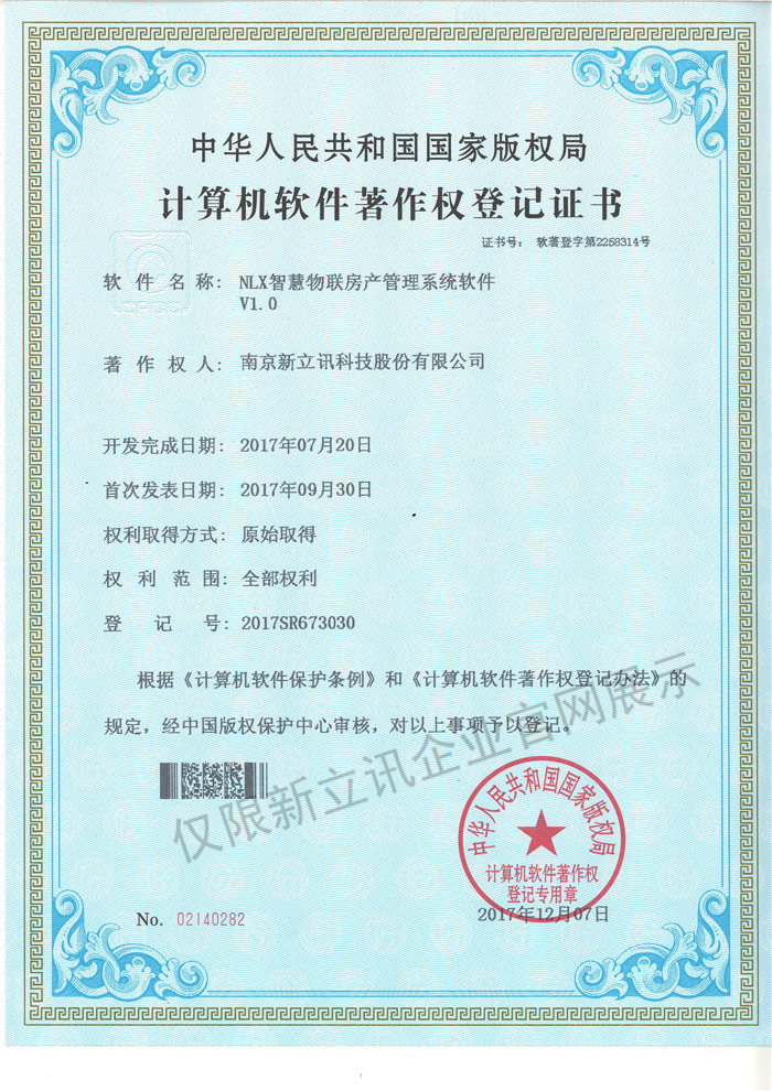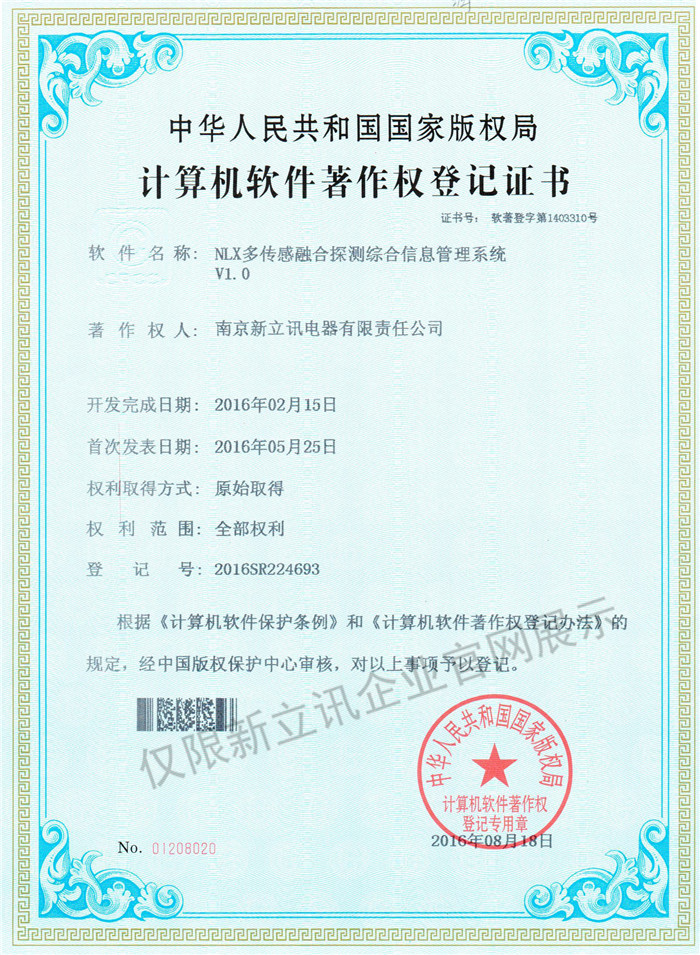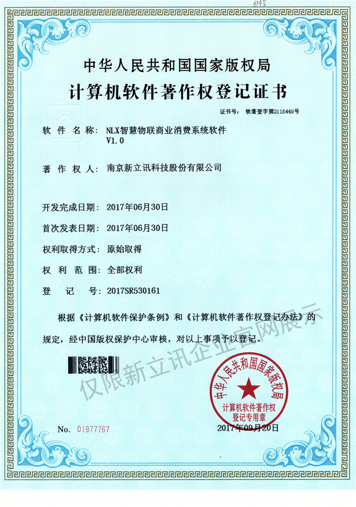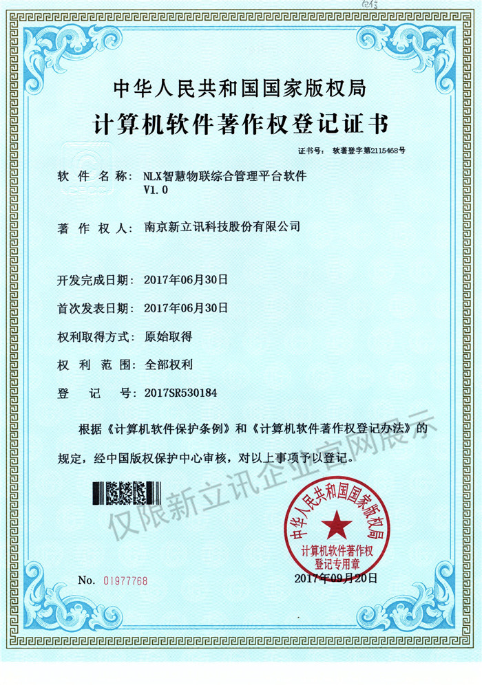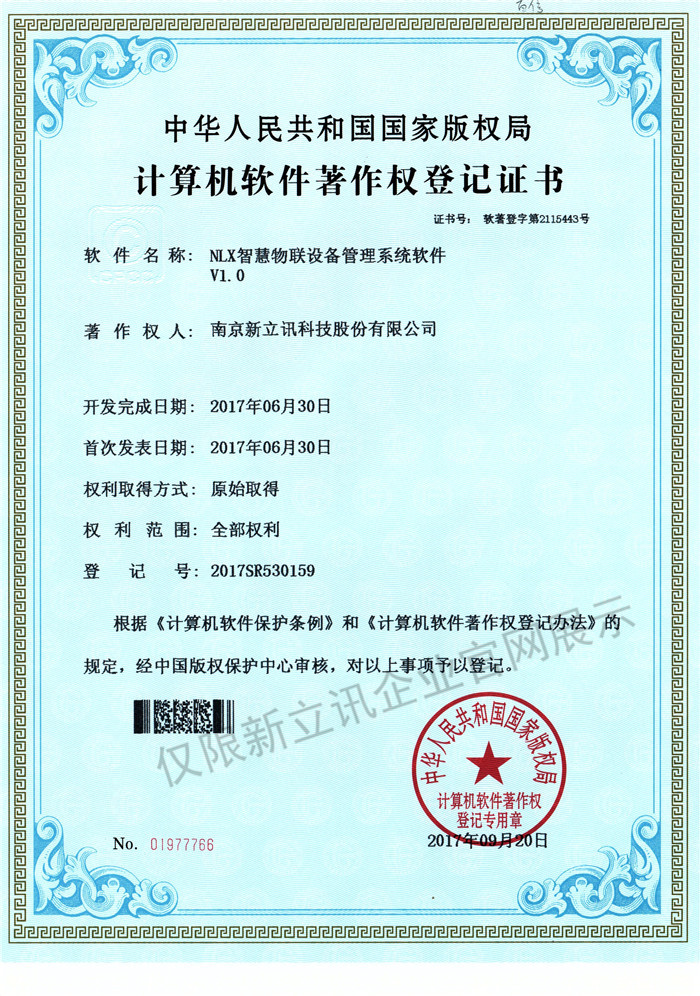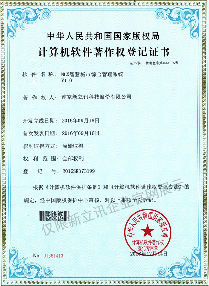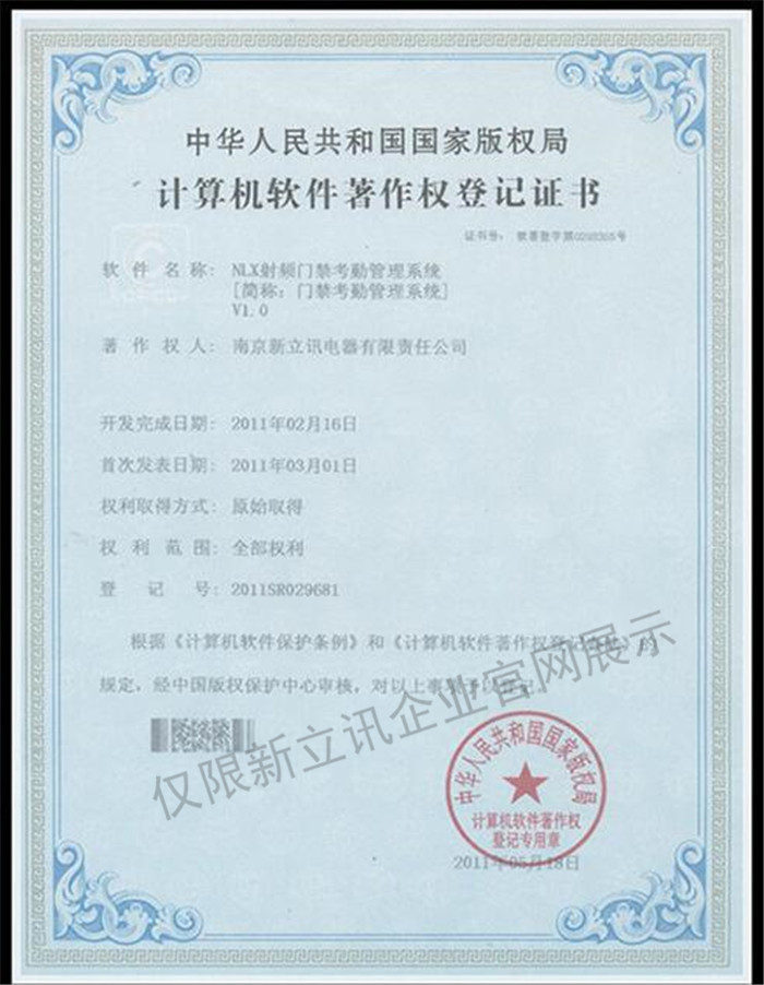 • 2016-07-20新立訊軟件著作權證書--NLX射頻門禁考勤管理系統V1.0查看