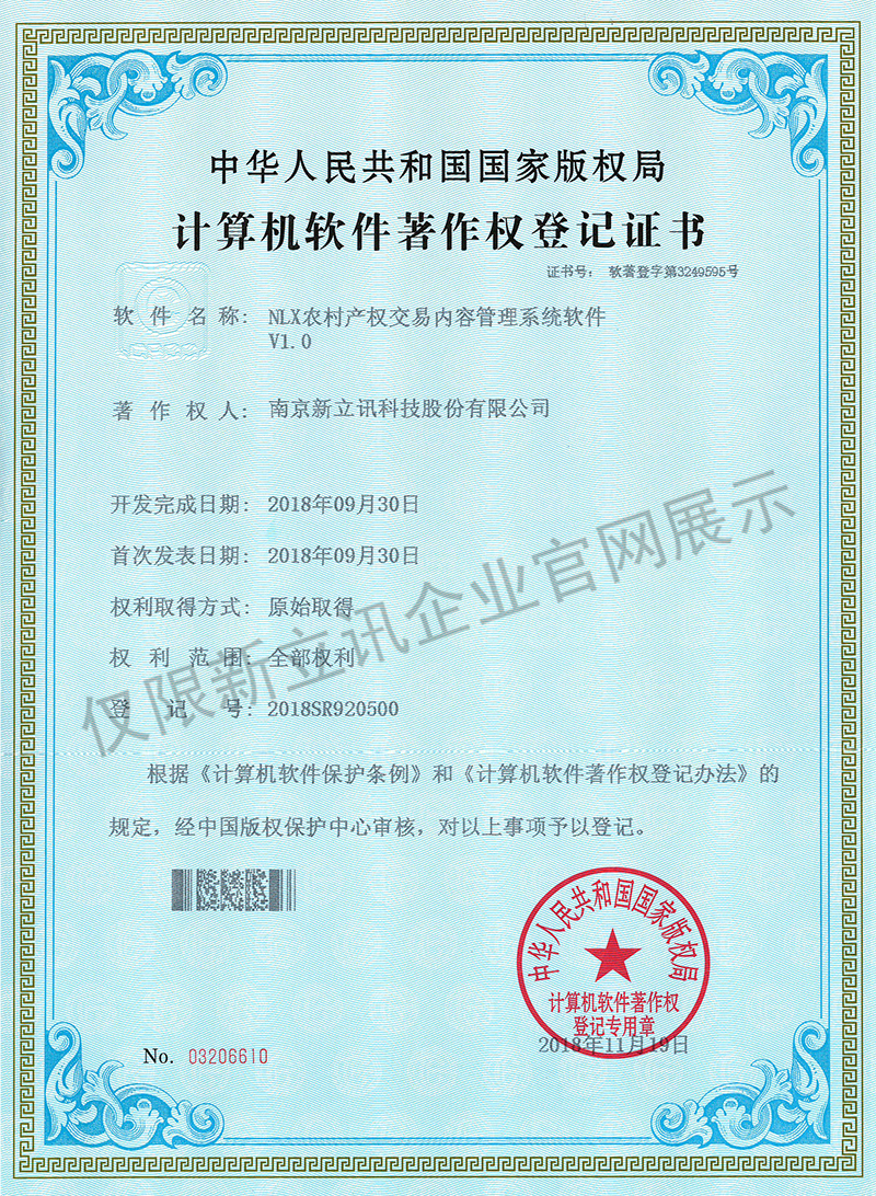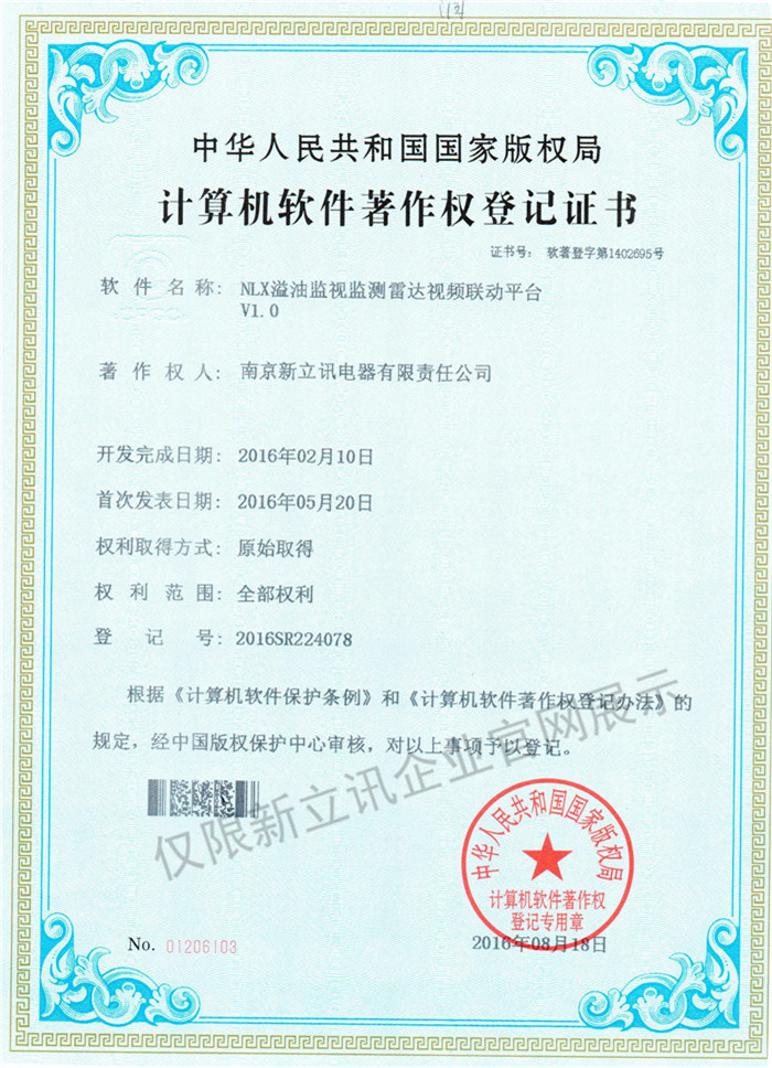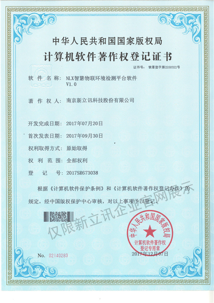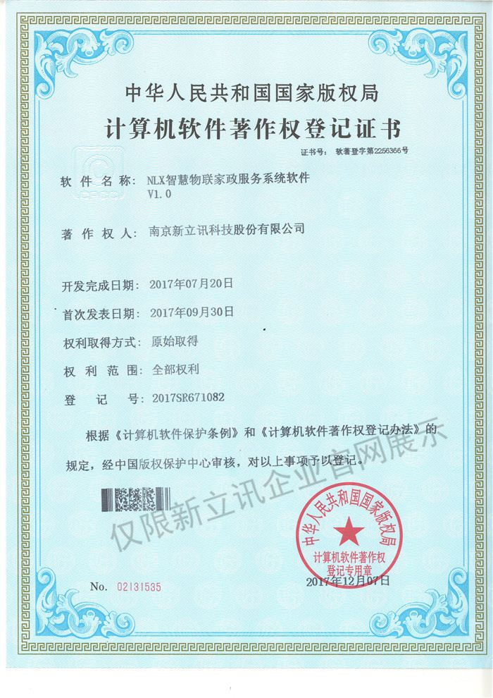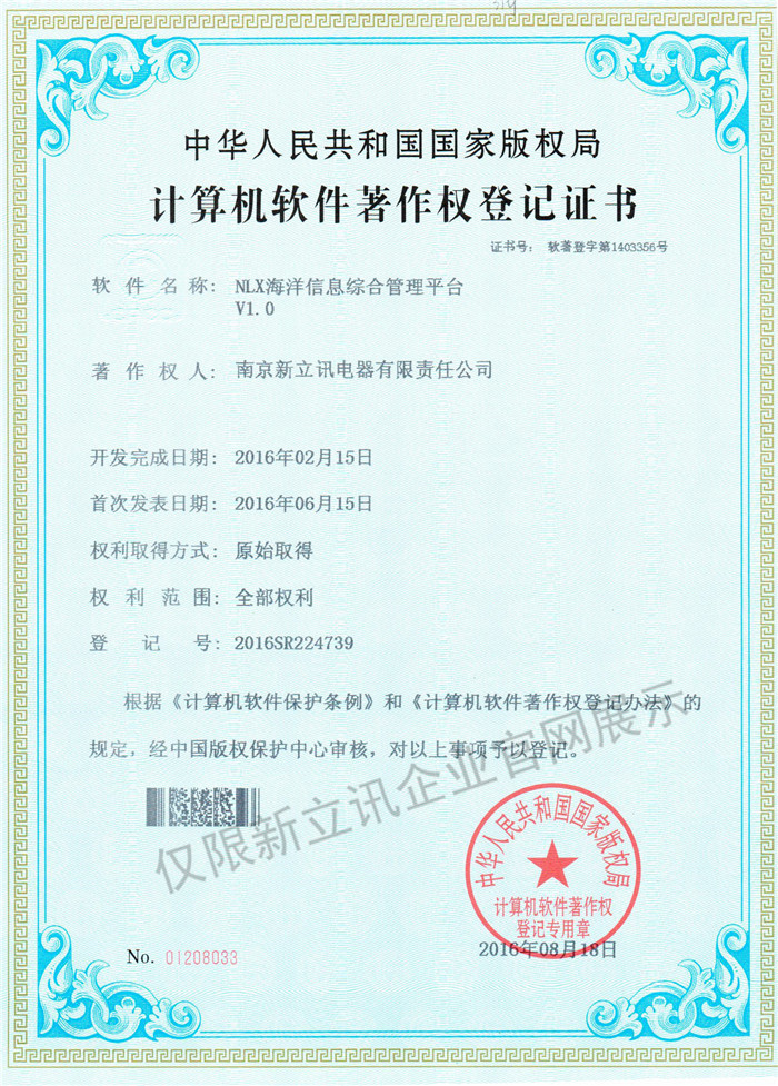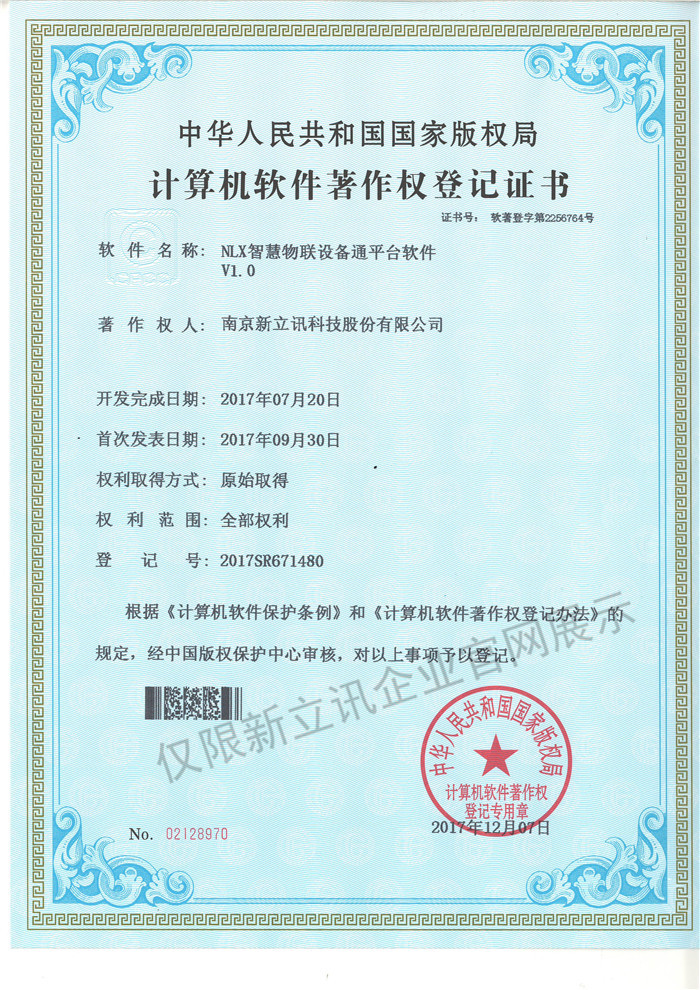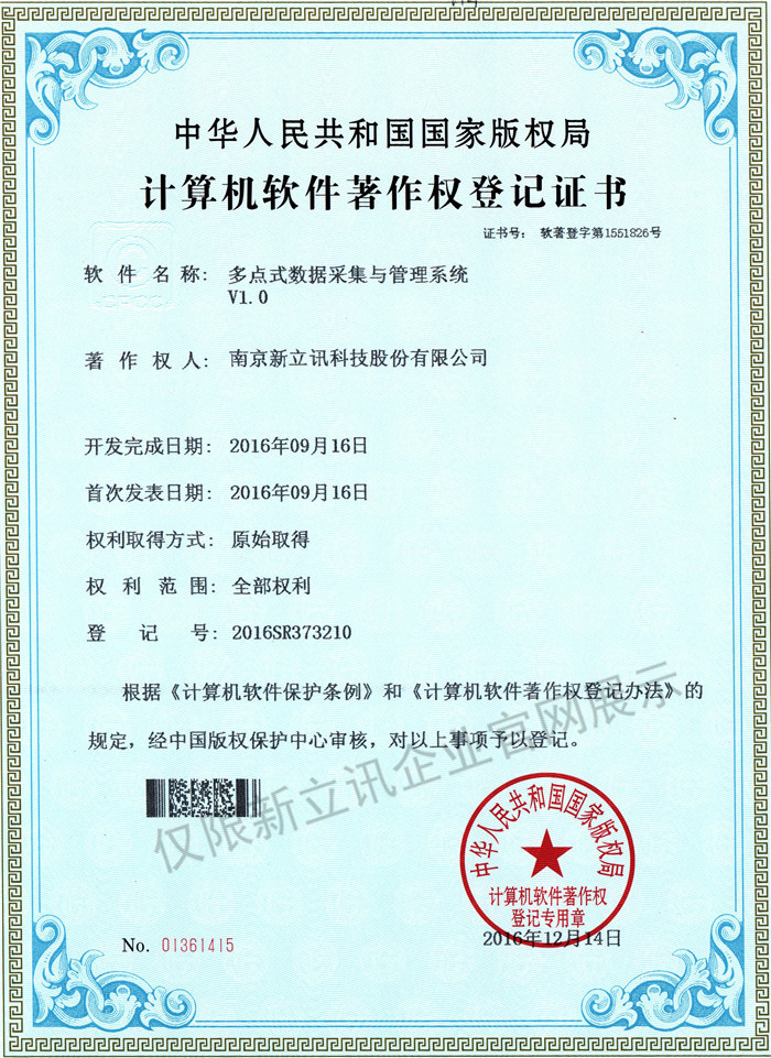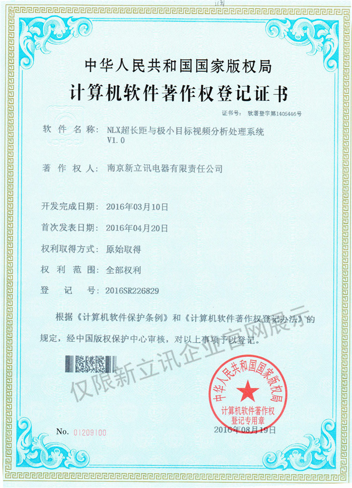 • 2016-07-20新立訊軟件著作權證書--NLX射頻門禁考勤管理系統V1.0查看