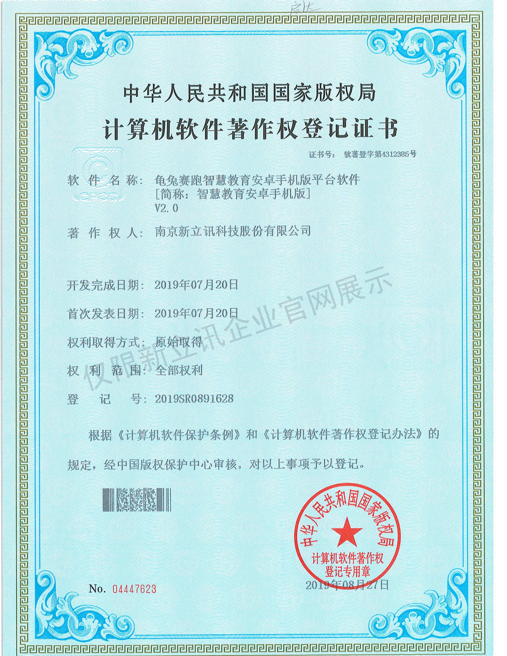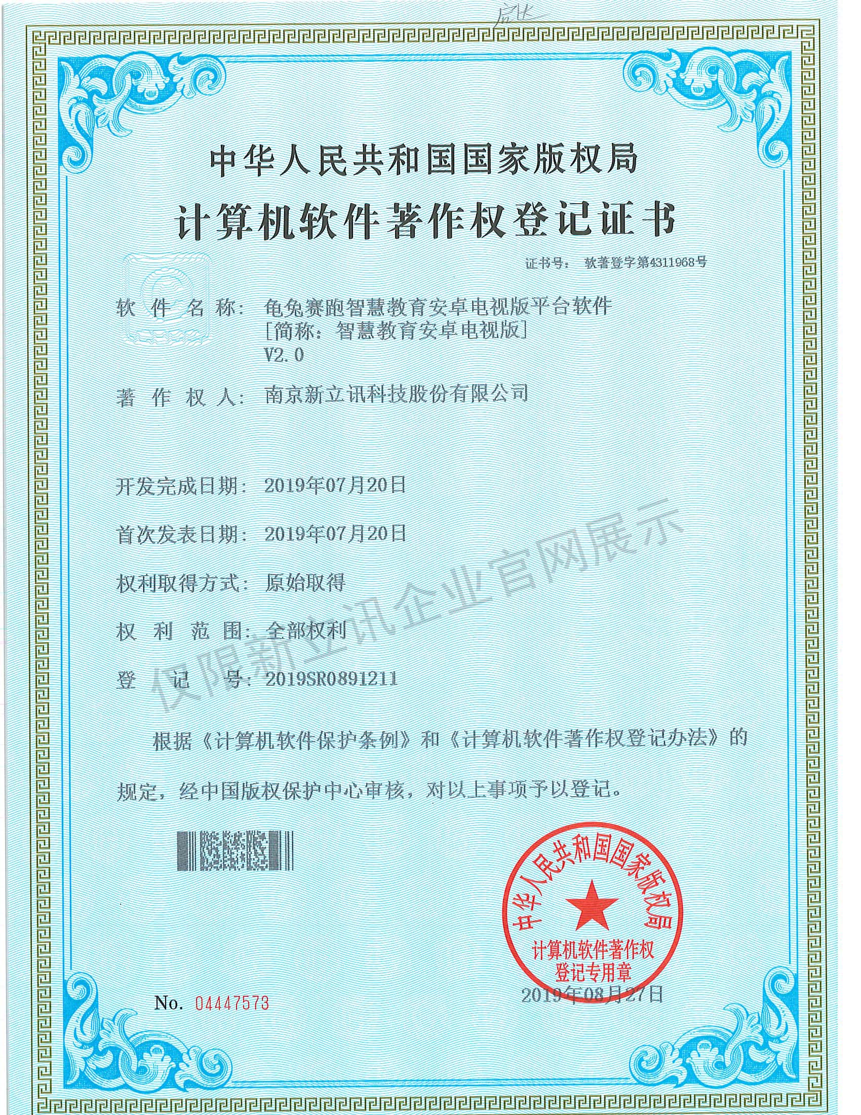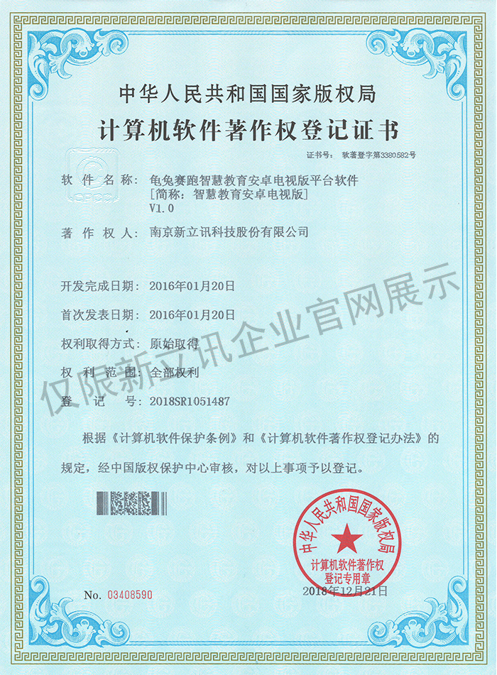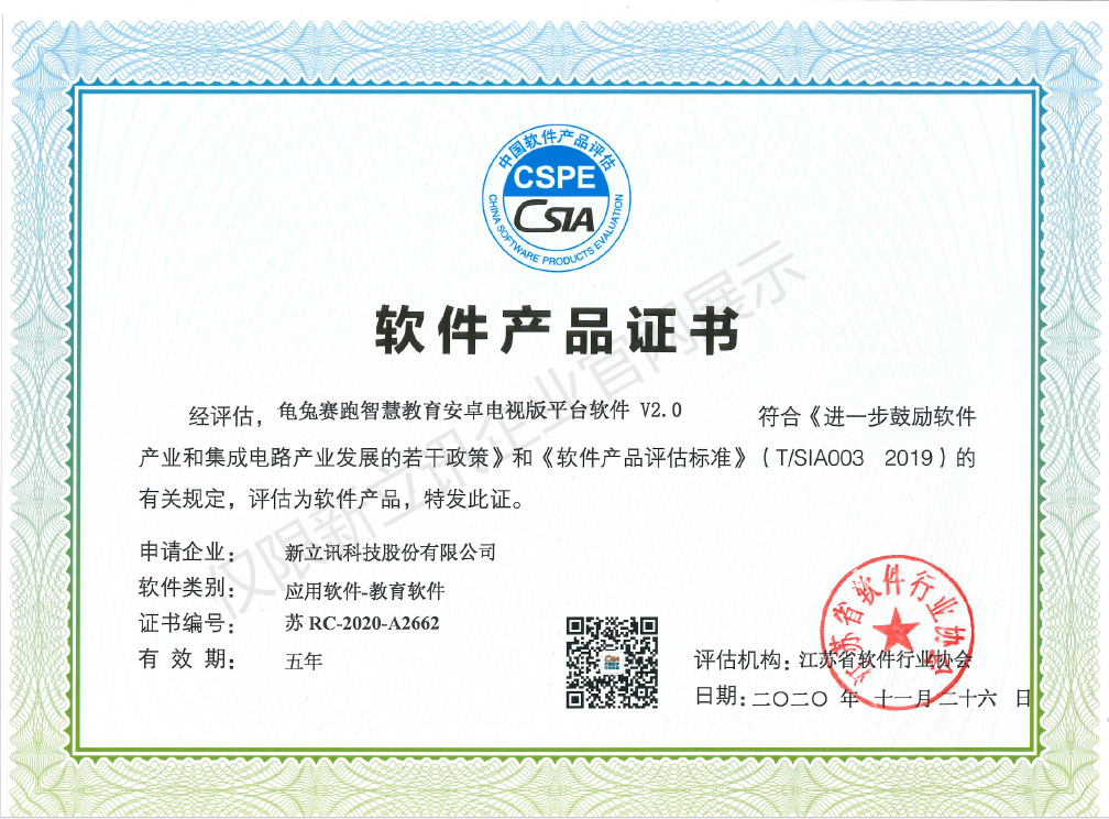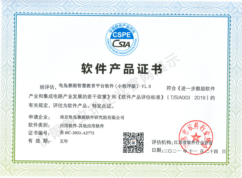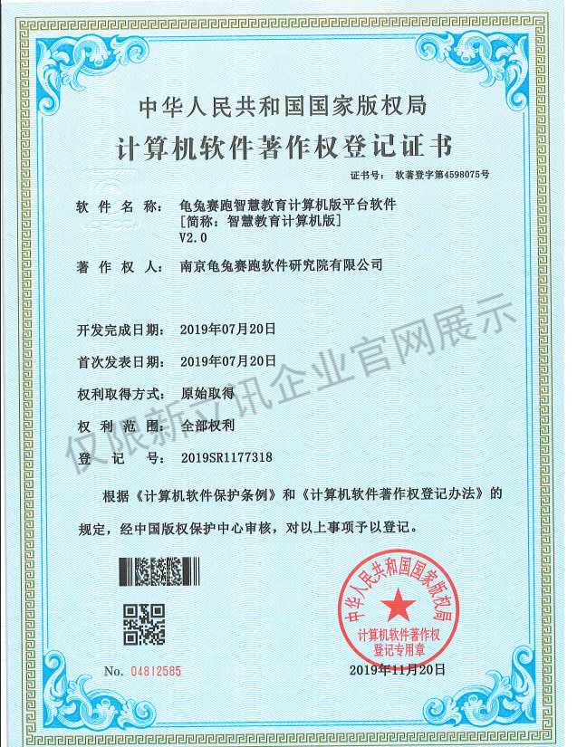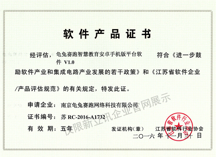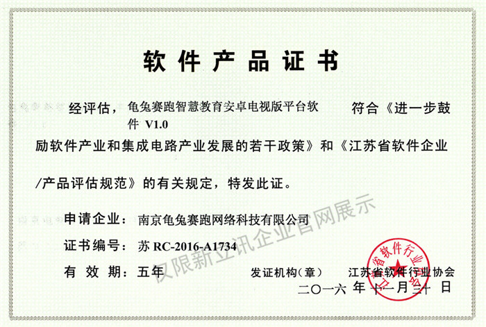 • 2020-12-28龜兔賽跑智慧教育安卓電視版平臺軟件V2.0軟件產品證書查看