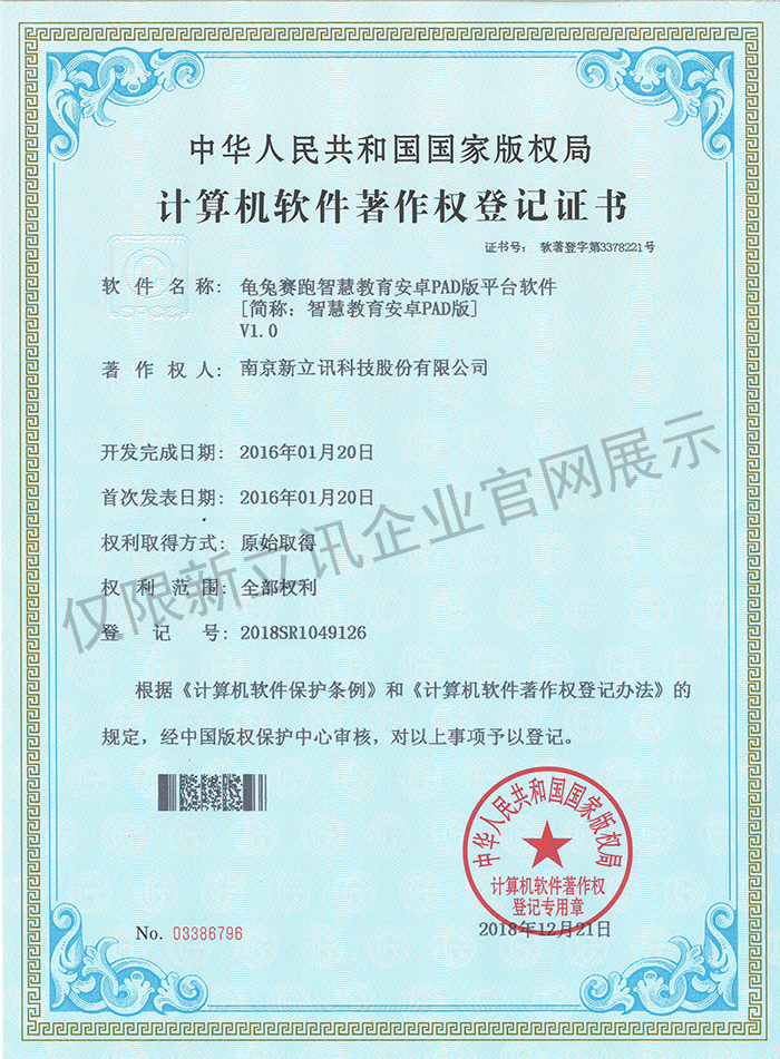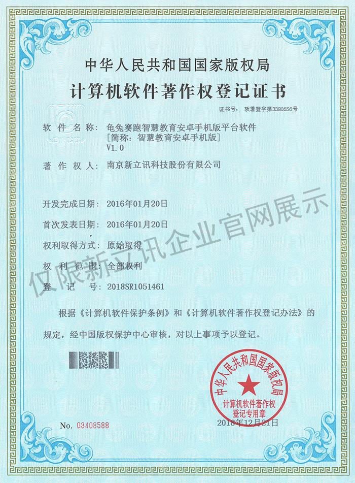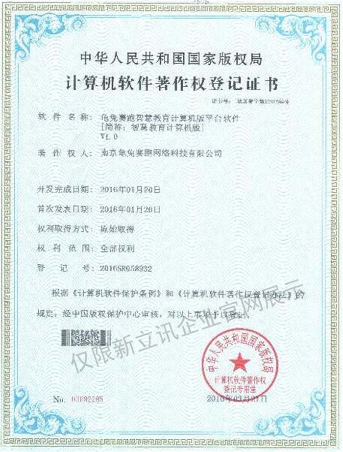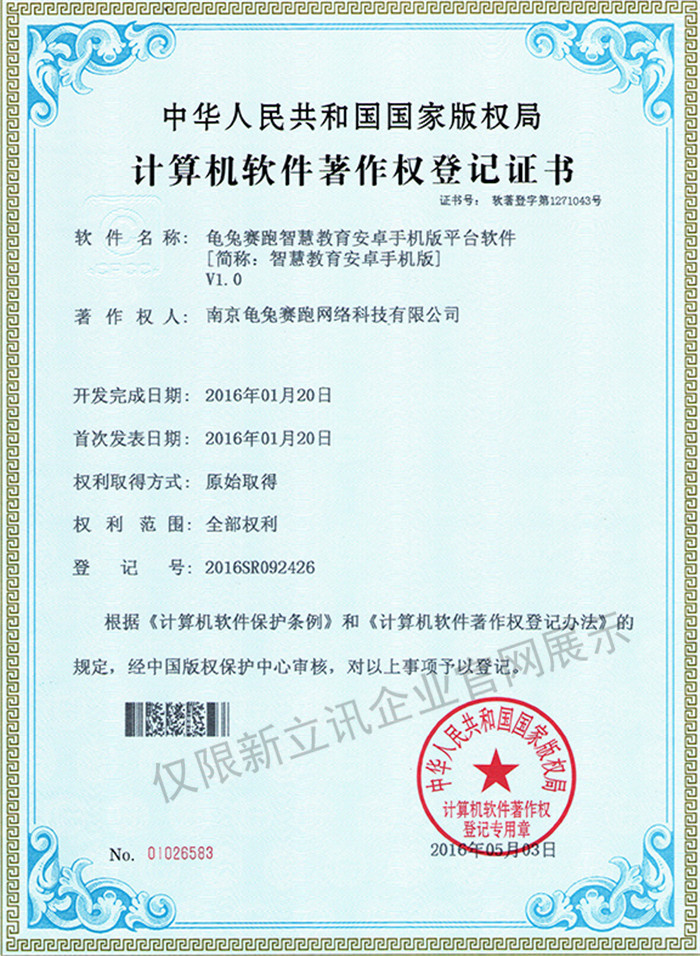 • 2016-07-20龜兔賽跑軟件著作權證書--龜兔賽跑智慧教育安卓手機版平臺軟件V1.0查看