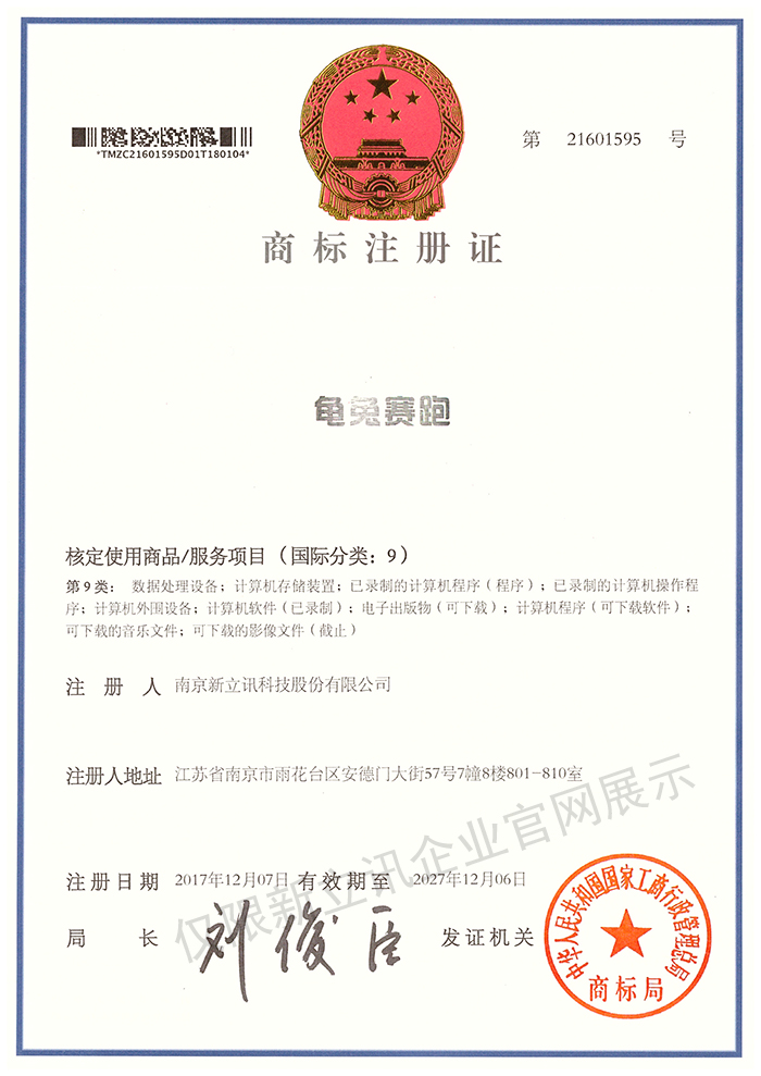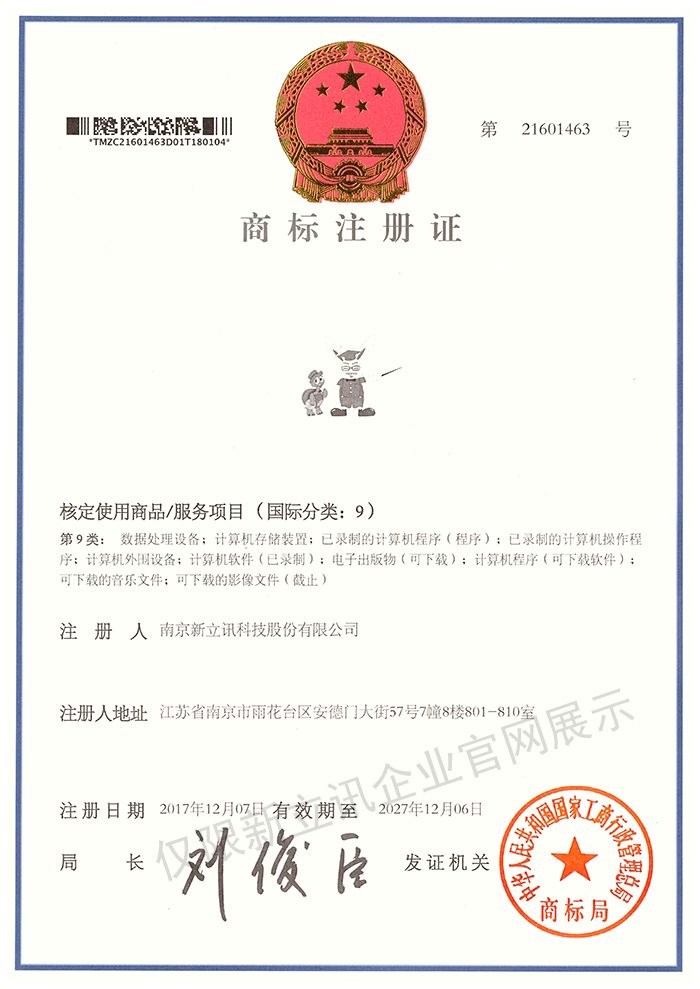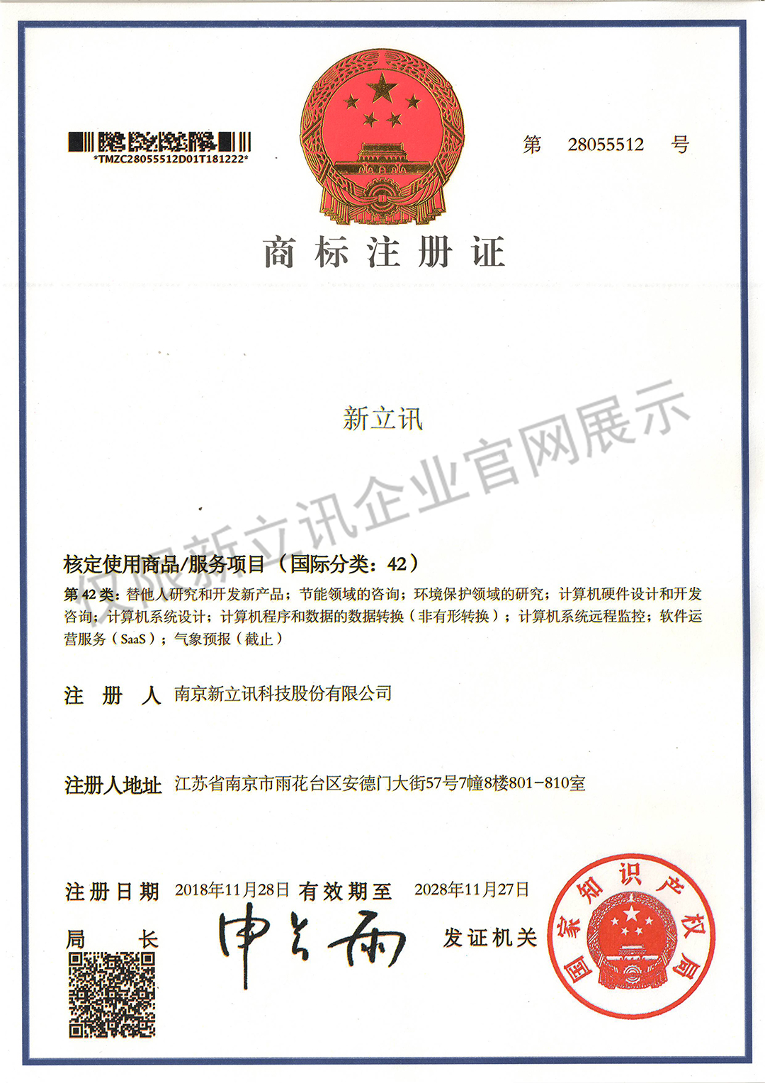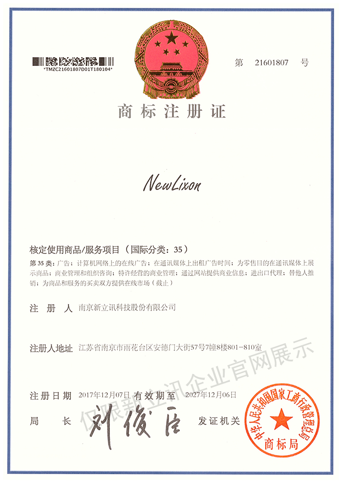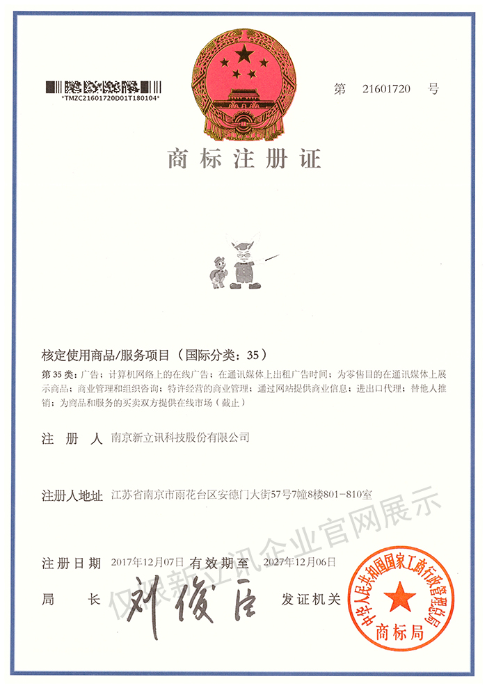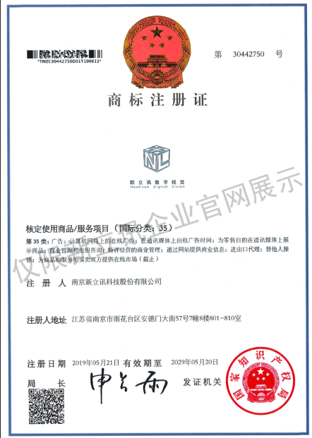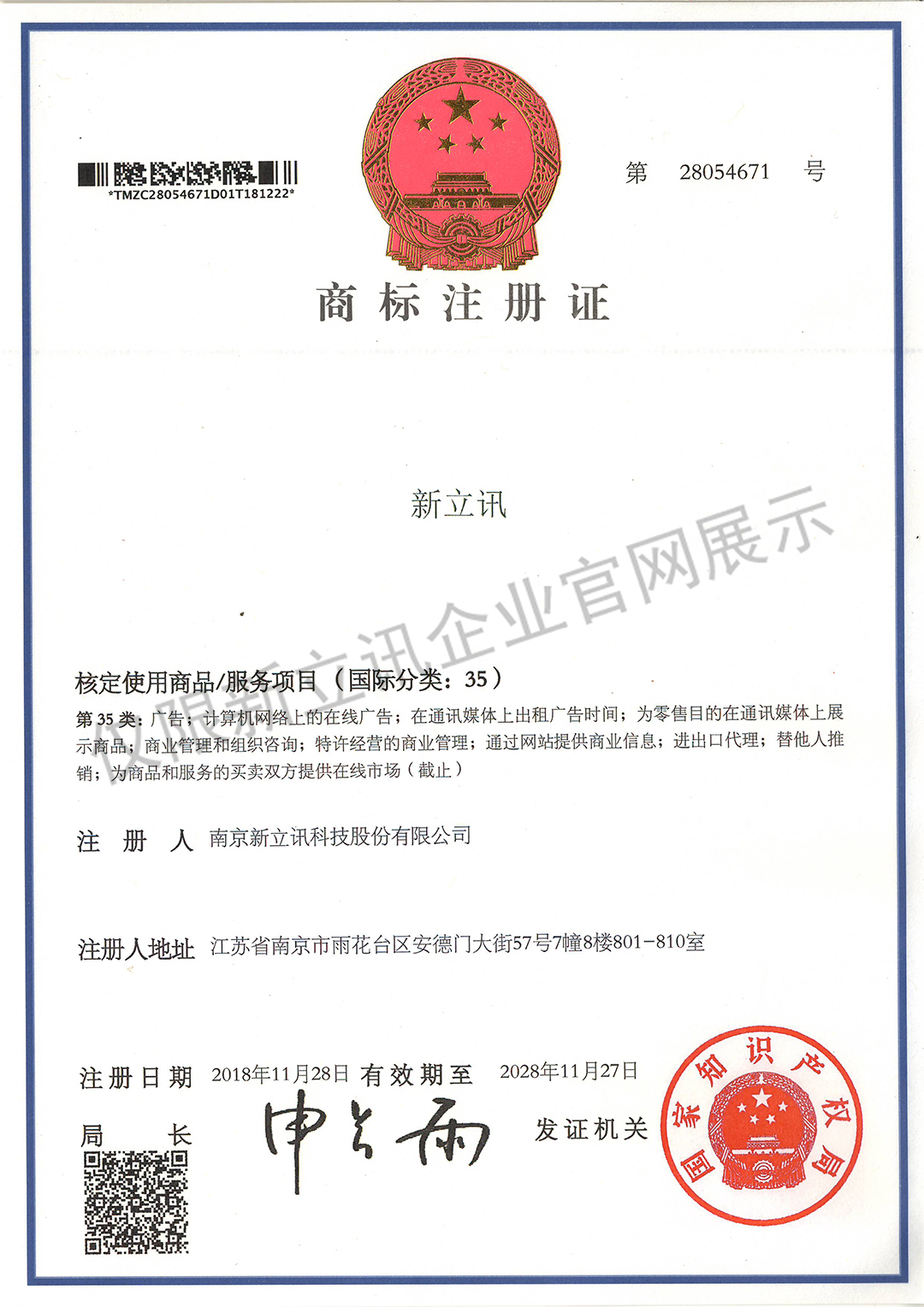 • 2019-12-03第30442750號 新立訊商標注冊證(國際分類:35)查看
