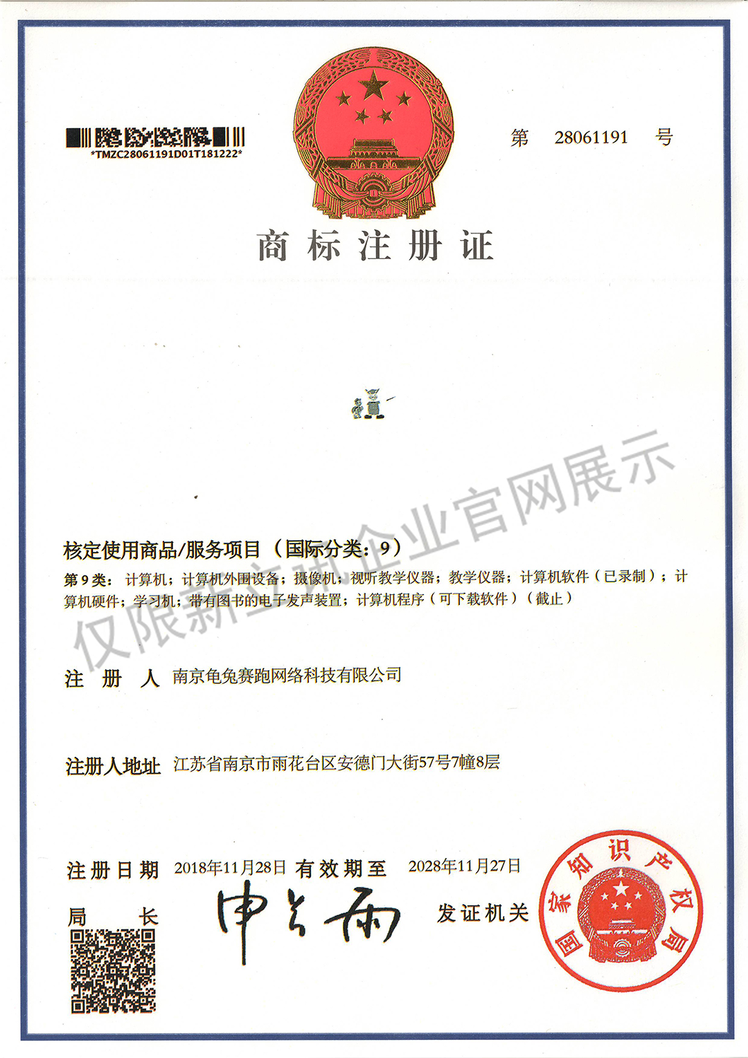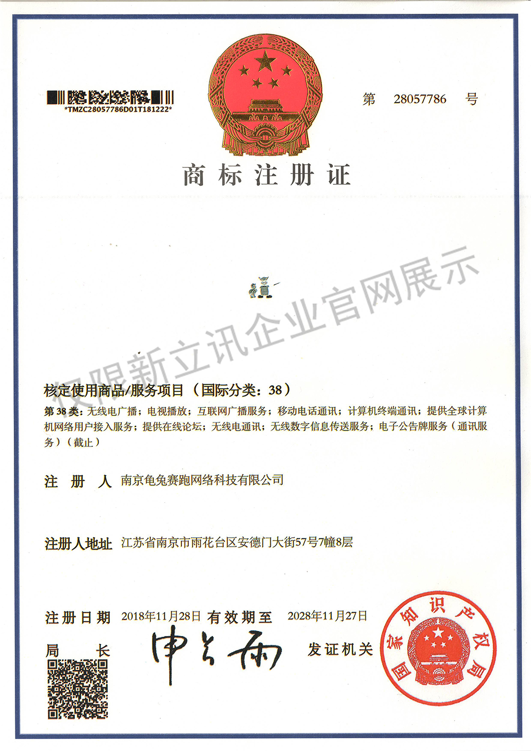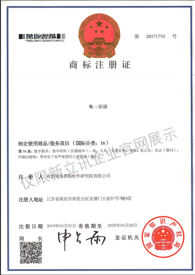 • 2019-11-12龜兔賽跑商標注冊證:第28071792號(國際分類:16類)查看