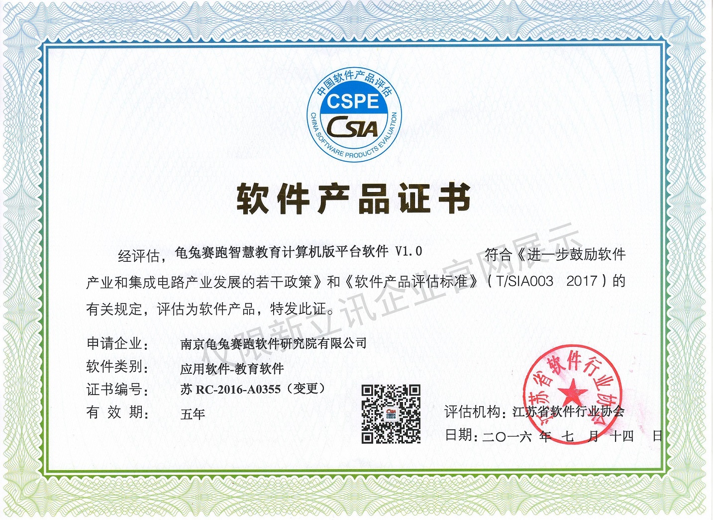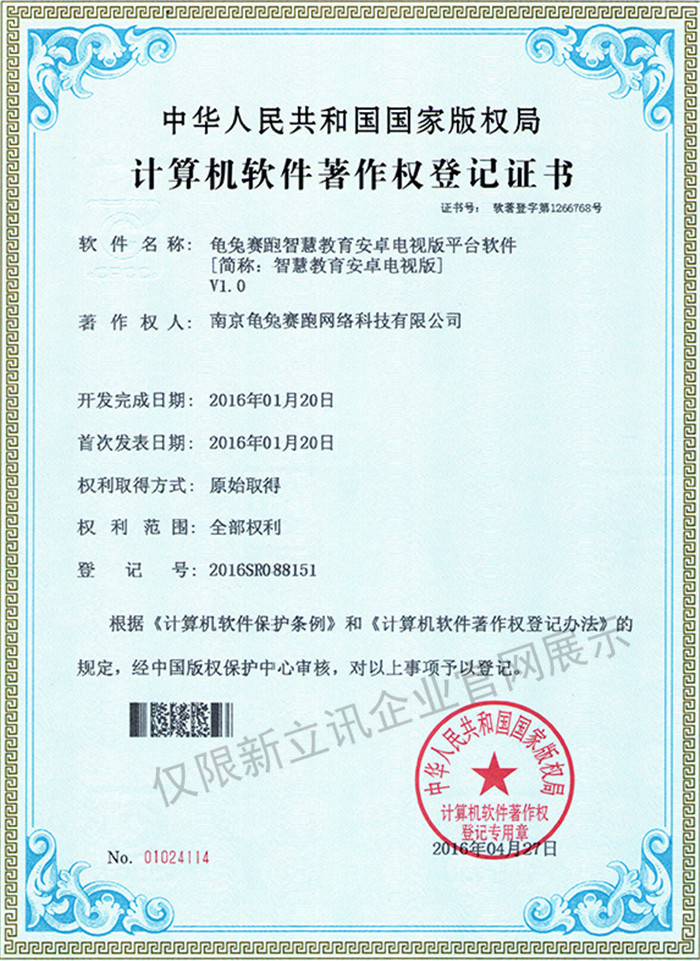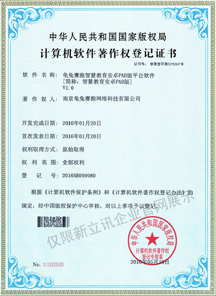 • 2016-07-20龜兔賽跑軟件著作權證書--龜兔賽跑智慧教育安卓電視版平臺軟件V1.0查看