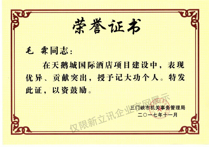 • 2017-11-29天鵝城國際酒店突出貢獻證書查看