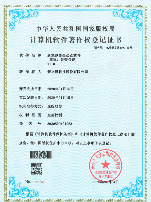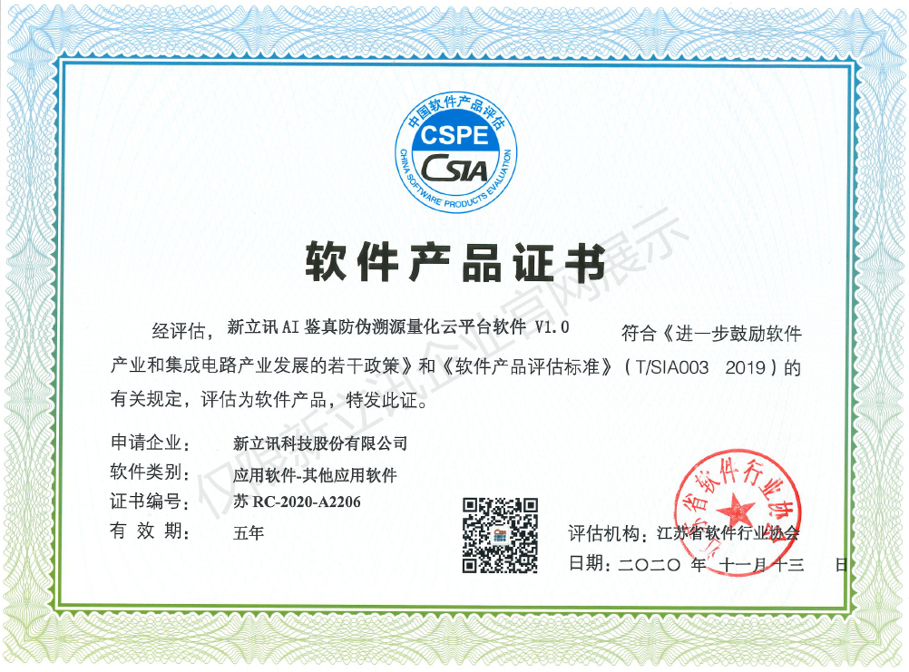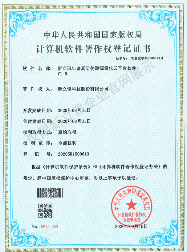 • 2020-12-28新立訊AI鑒真防偽溯源量化云平臺軟件V1.0軟件產品證書查看