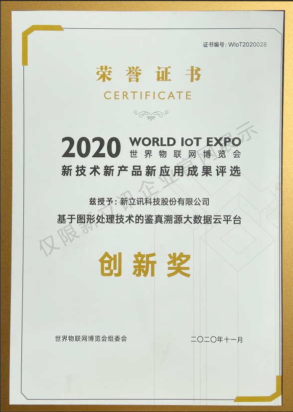 • 2020-11-232020世界物聯網博覽會新技術新產品應用創新獎(鑒真溯源大數據云平臺)查看