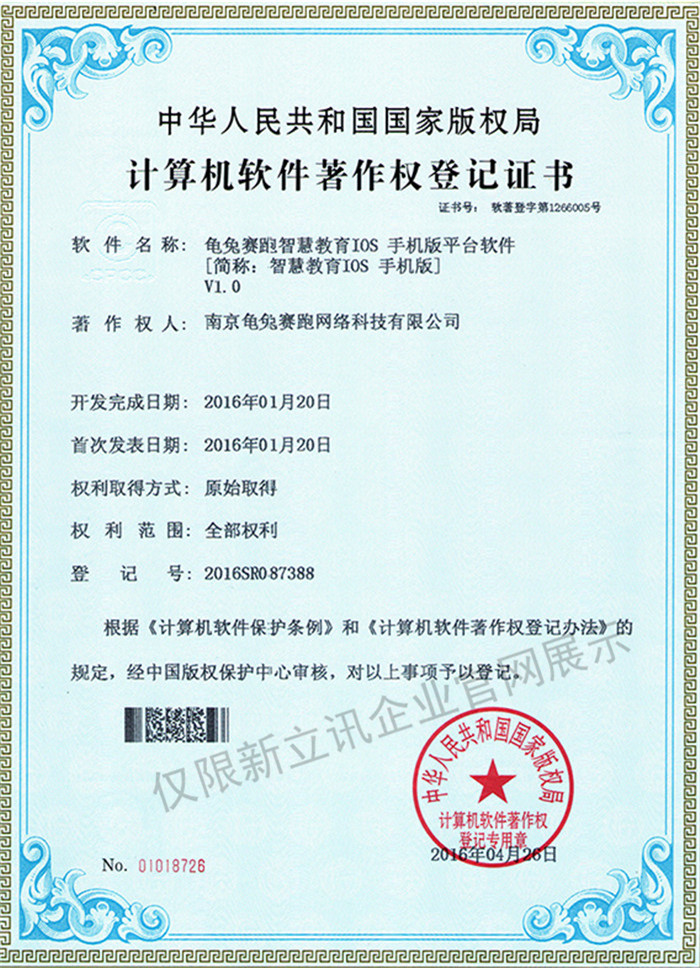 • 2016-07-20龜兔賽跑軟件著作權證書--龜兔賽跑智慧教育IOS手機版平臺軟件V1.0查看