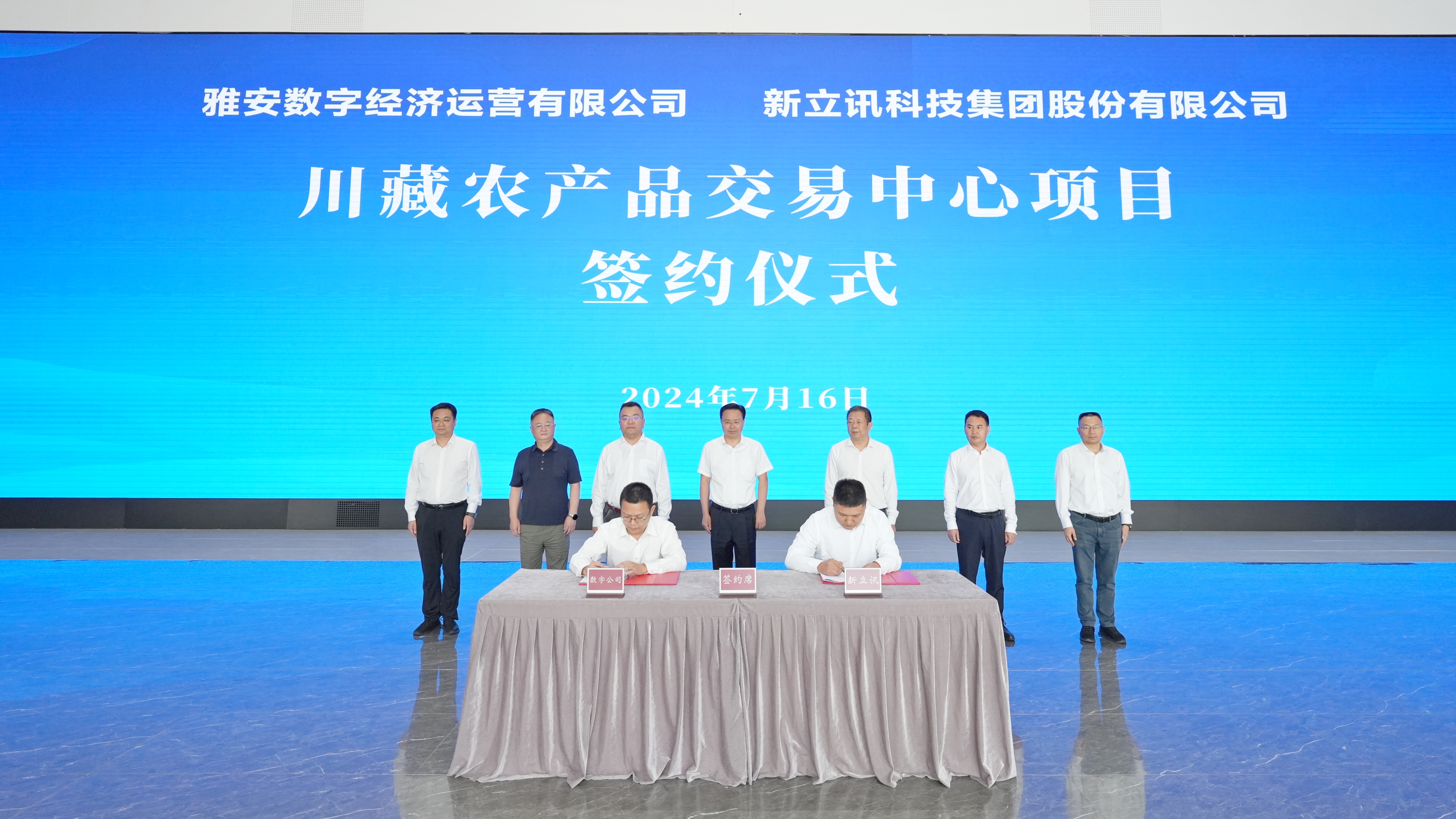 2024年7月16日,川藏農產品交易中心項目簽約儀式在四川雅安大數據產業園舉行,雅安市委副書記、雅安經開區黨工委書記劉吉祥,雅安經開區黨工委副書記、管委會主任羅剛,市農業農村局黨組書記、局長宋洪虎,市商務局黨組書記、局長蔡曉然,雅州集團黨委書記、董事長周顯祥,產投集團黨委書記、董事長郭濤,新立訊科技集團董事長(兼青海、華東交易中心董事長)毛霖,新立訊集團戰略執委陳志勝等嘉賓出席簽約儀式,儀式由雅安經開區黨工委委員、管委會副主任喻思皓主持。