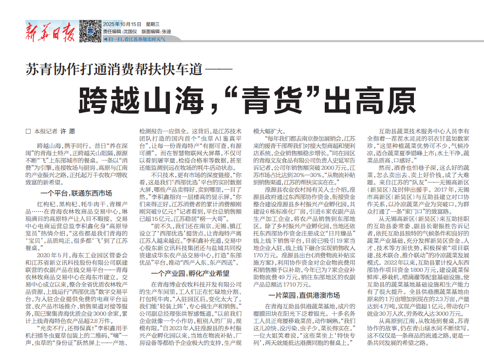 “前不久,我們還在南京、無錫、鎮(zhèn)江設(shè)立了‘西部優(yōu)選’提貨點,讓青海特產(chǎn)離江蘇人越來越近。”李積鑫補充道,交易中心股東新立訊科技集團還與鹽城共同投資建成華東農(nóng)產(chǎn)品交易中心,打造“東部優(yōu)品”平臺,推動“西產(chǎn)入東、東產(chǎn)西送”。