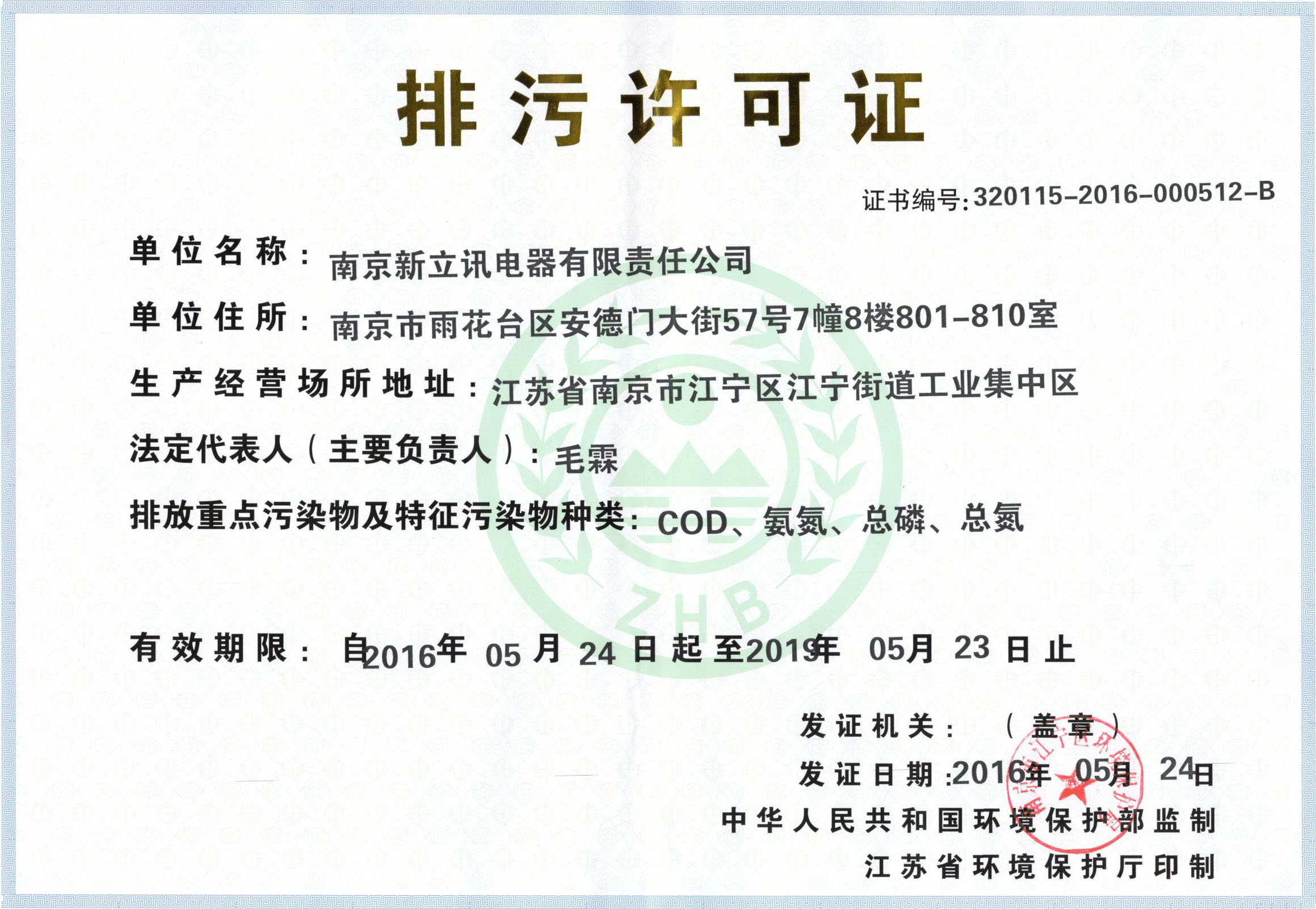 2016年5月24日,南京新立訊電器有限責(zé)任公司獲得江蘇省環(huán)境保護(hù)廳頒發(fā)的最新版排污許可證。南京新立訊電器有限責(zé)任公司成立以來,領(lǐng)導(dǎo)班子高度重視環(huán)境保護(hù)工作,多次就環(huán)保驗(yàn)收及排污許可證的取得等事宜進(jìn)行安排部署,極大地促進(jìn)此項(xiàng)工作的完成。
