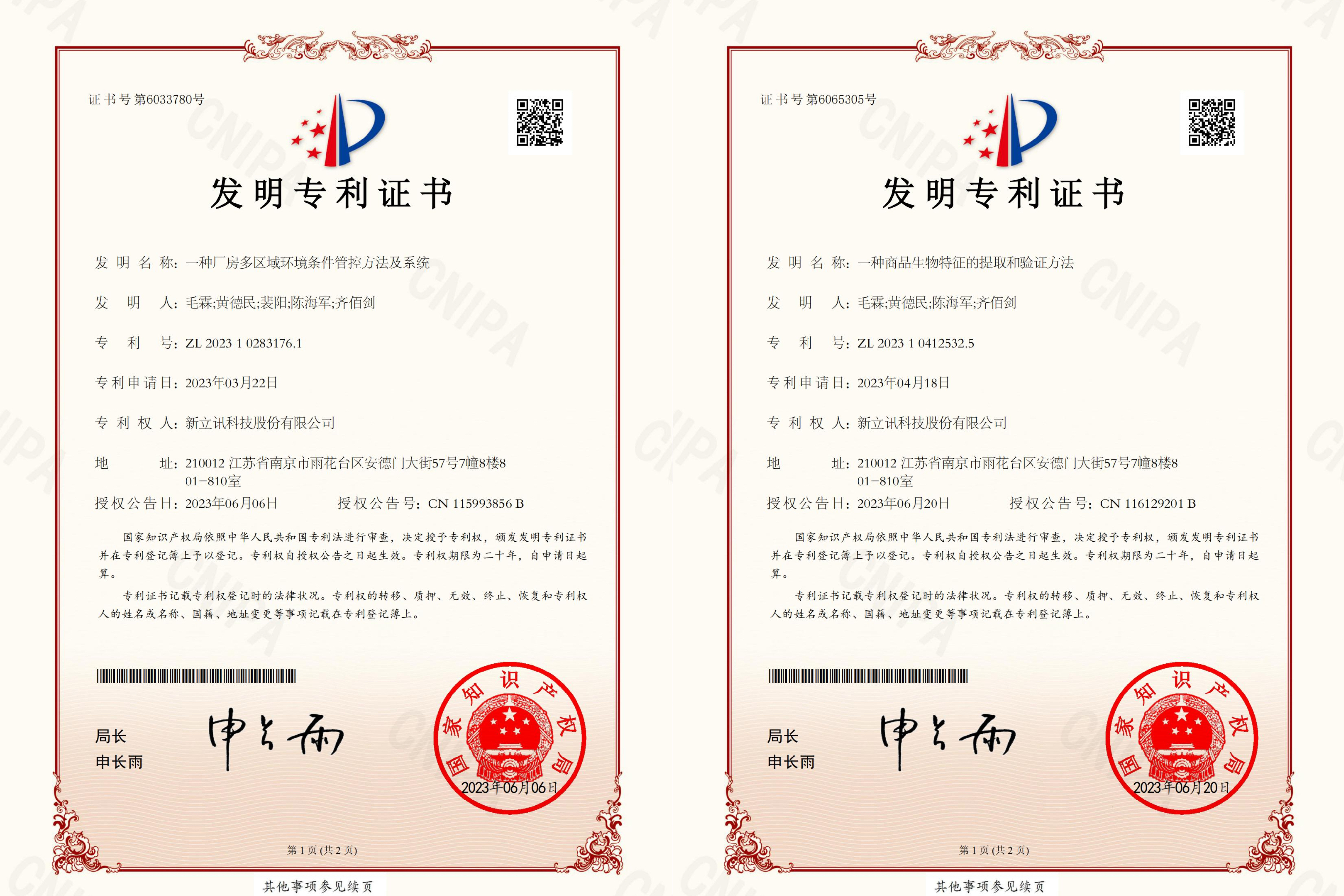 6月,新立訊知識產權領域新獲兩項發明專利,分別是“一種商品生物特征的提取和驗證方法”(專利號:ZL202310412532.5),“一種廠房多區域環境條件管控方法及系統”(專利號:ZL202310283176.1)和,均為我司原始取得,是技術創新和研發方面取得的重要成果。