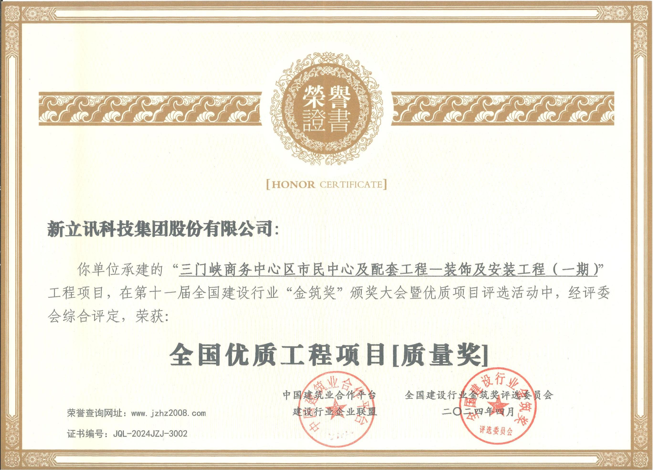“中國電子與智能化設計、施工優秀企業金獎”是對新立訊科技集團在電子與智能化領域的杰出貢獻的肯定。作為OBO信息服務商,新立訊在DICT(多融合數據集成)與農產業互聯網交易平臺業務方面有著深厚的積累和豐富的經驗,為客戶提供了一系列高效、智能的解決方案,幫助客戶實現業務的快速發展和數字化轉型。同時,新立訊還榮獲“全國優質工程項目質量獎”,是對新立訊在工程項目質量管控方面的高度認可。新立訊始終堅持“質量第一、客戶至上”的原則,以嚴格的質量管理體系和精湛的技術實力,確保每一個項目的質量達到行業領先水平。