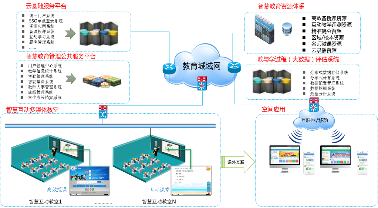 智慧校園是基于動態學習數據分析和“云、網、端”的運用,實現教學決策數據化、評價反饋即時化、交流互動立體化、資源推送智能化,創設有利于協作交流和意義建構的學習環境,通過智慧的教與學,促進全體學生實現符合個性化成長規律的智慧發展。